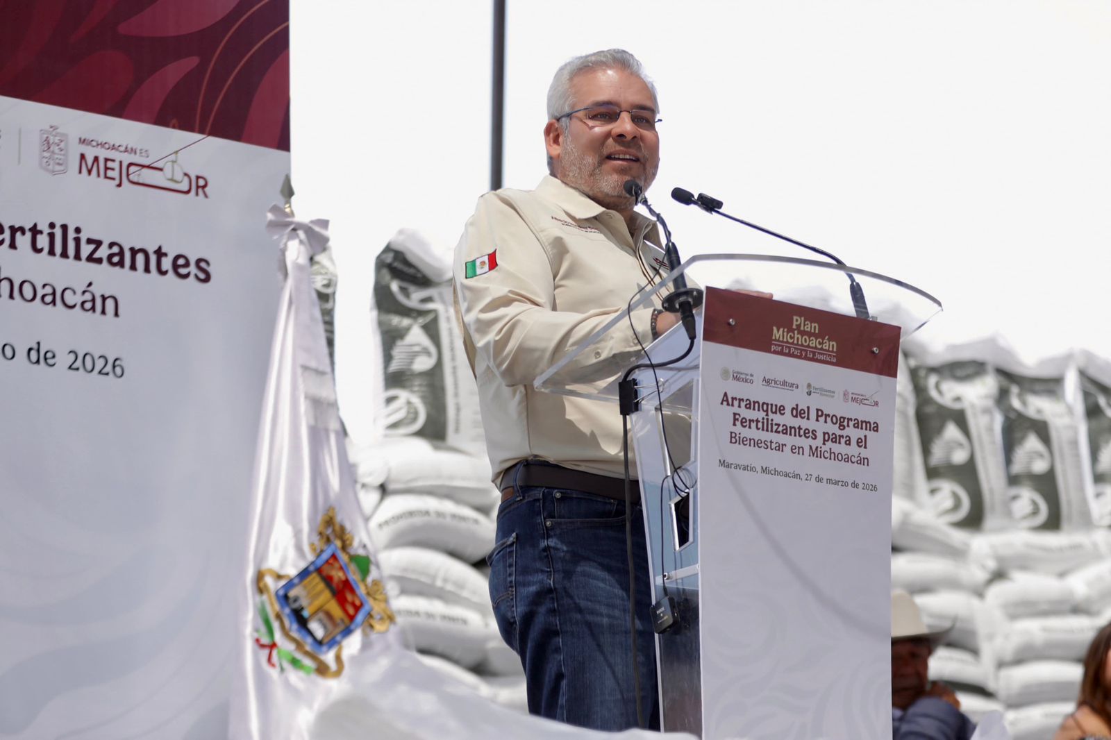 Con este apoyo se benefician 90 mil productores para cubrir cerca de 140 mil hectáreas de cultivos Maravatío, Michoacán, 27 de marzo de 2026.- El gobernador Alfredo Ramírez Bedolla junto con Julio Berdegué Sacristán, secretario de Agricultura y Desarrollo Rural, dieron arranque al Programa Fertilizantes para el Bienestar 2026, el cual se entregará este año de manera gratuita a 90 mil produc...