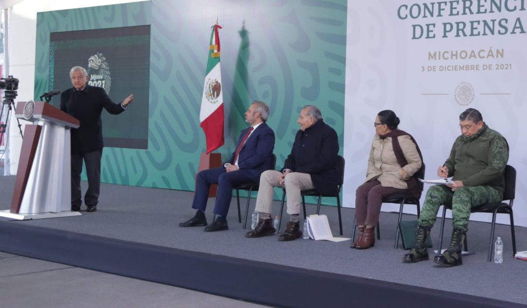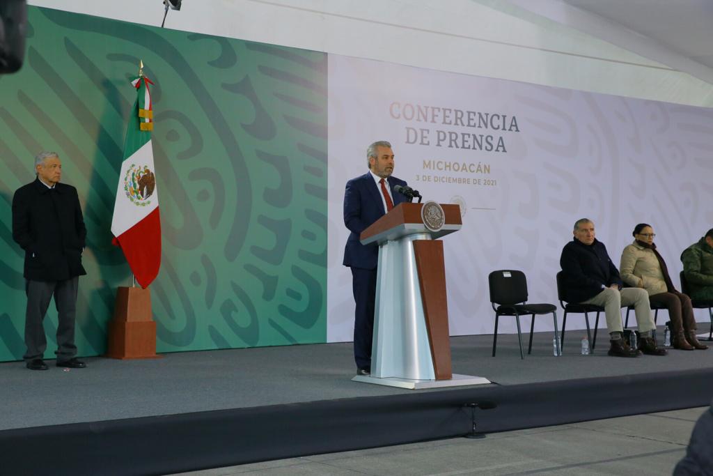 Morelia, Michoacán, 3 de diciembre del 2021. El gobernador Alfredo Ramírez Bedolla celebró que el Presidente Andrés Manuel López Obrador instruyera ampliar el apoyo a Michoacán para garantizar la paz en los municipios de Coalcomán y Tepalcatepec.