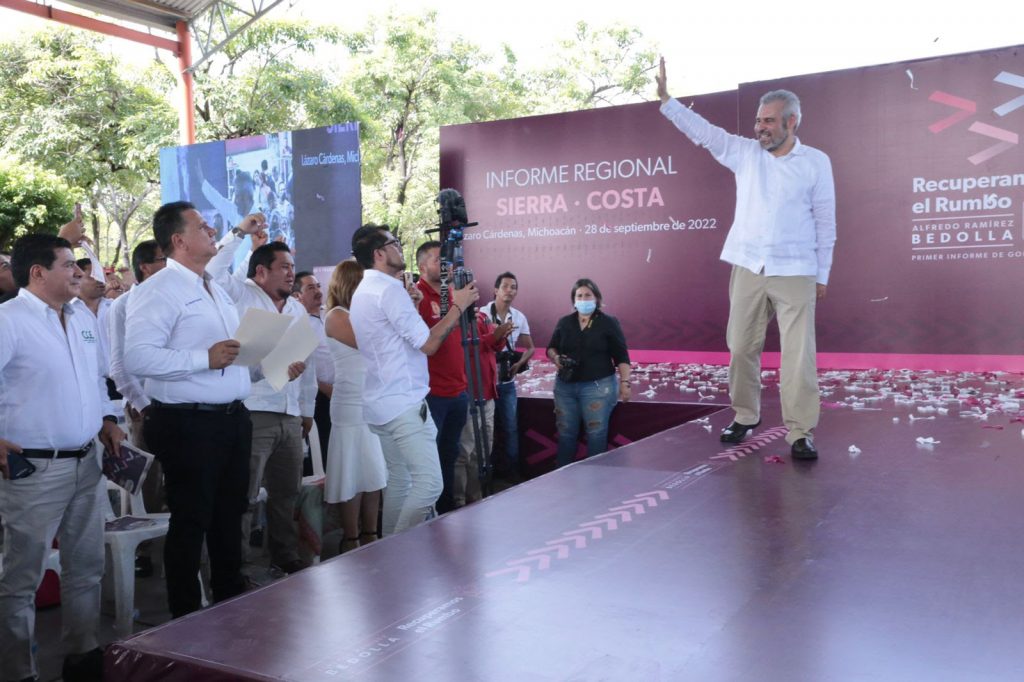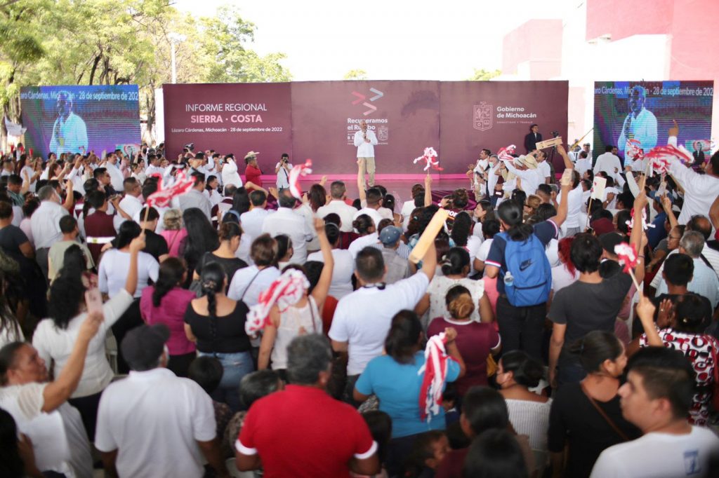 Durante el Informe Regional Sierra-Costa, realizado en Lázaro Cárdenas, el mandatario reiteró su respaldo a las localidades que resultaron afectadas y convocó a las autoridades municipales a trabajar en conjunto a beneficio de la población y por el desarrollo social y económico.