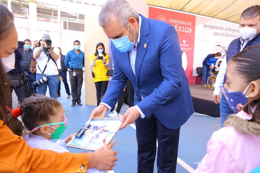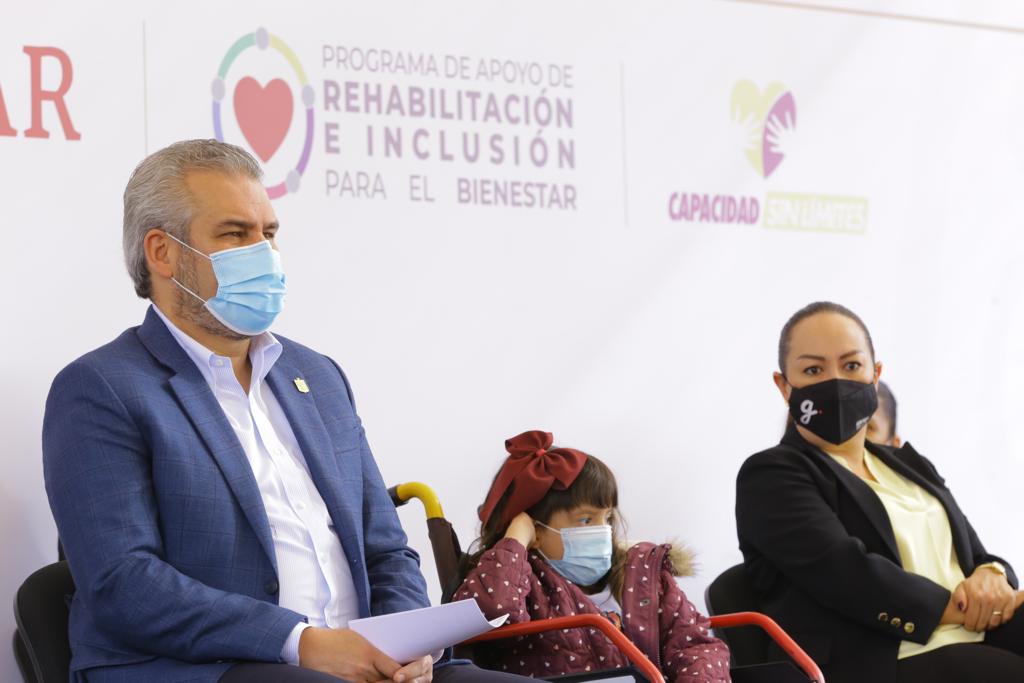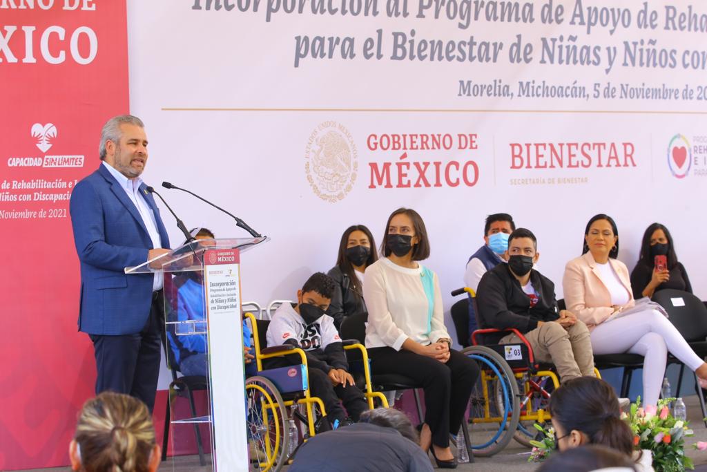 Morelia, Michoacán, 05 de noviembre del 2021.- El gobernador Alfredo Ramírez Bedolla destacó el compromiso conjunto del Gobierno del Estado y del Gobierno de México hacia las personas con discapacidad, sobre todo con niñas y niños a quienes esta mañana les entregaron carnets Bienestar