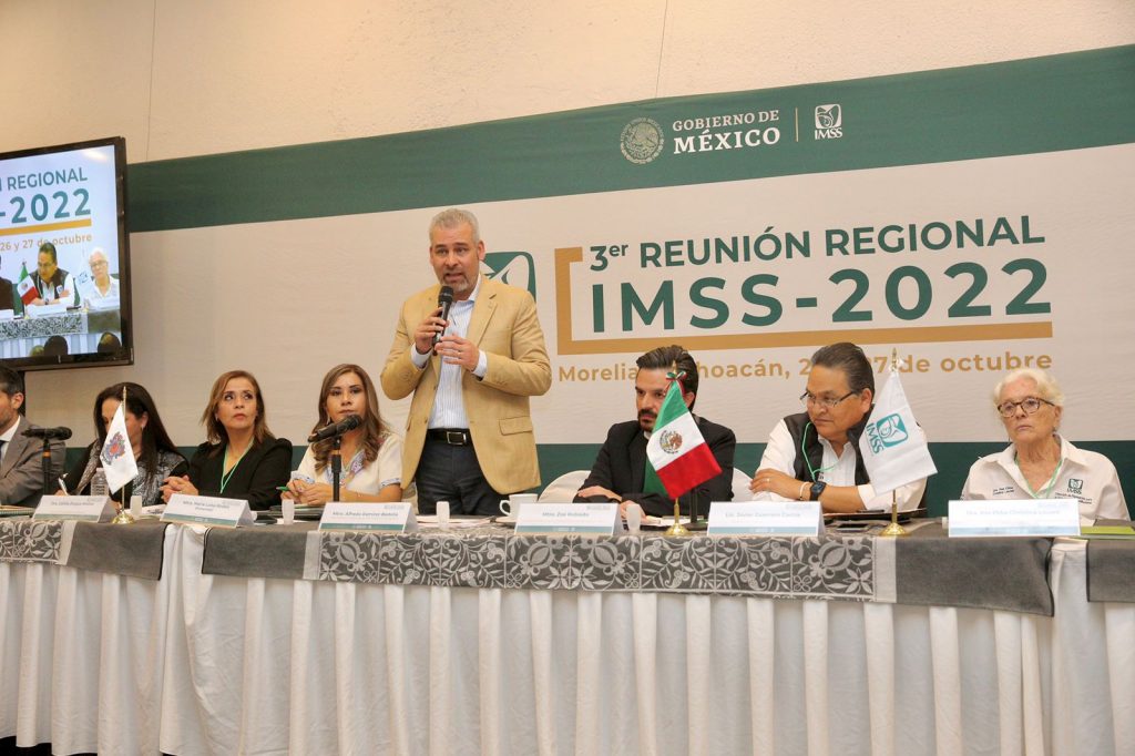 Morelia, Michoacan, 26 de octubre del 2022.- Durante la Tercera Reunión Regional del IMSS 2022, el gobernador Alfredo Ramírez Bedolla, acompañado del director general del Instituto Zoe Alejandro Robledo Aburto, resaltó que tras los trabajos coordinados con el sector agrícola y la federación está todo listo para incorporar a 100 mil trabajadores agrícolas al seguro social.