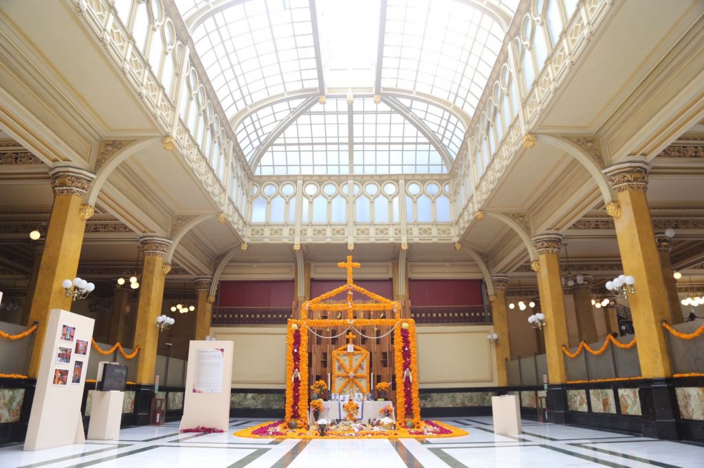 El altar inspirado en la tradición p’urhépecha de la comunidad de Santa Fe de la Laguna, fue dedicado a la pintora María Cenobia Izquierdo Gutiérrez, al periodista mexicano Cipriano Ricardo Gerónimo Flores Magón, al compositor michoacano Miguel Lerdo de Tejada y a Salvador Cuevas Ortega, trabajador del Servicio Postal Mexicano.